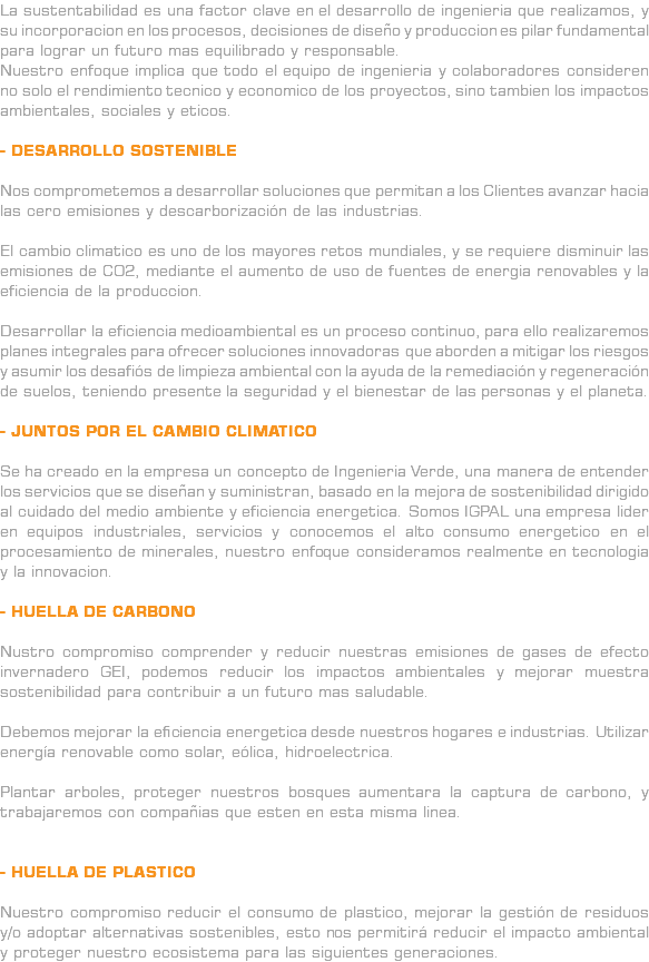 La sustentabilidad es una factor clave en el desarrollo de ingenieria que realizamos, y su incorporacion en los procesos, decisiones de diseño y produccion es pilar fundamental para lograr un futuro mas equilibrado y responsable. Nuestro enfoque implica que todo el equipo de ingenieria y colaboradores consideren no solo el rendimiento tecnico y economico de los proyectos, sino tambien los impactos ambientales, sociales y eticos. - DESARROLLO SOSTENIBLE Nos comprometemos a desarrollar soluciones que permitan a los Clientes avanzar hacia las cero emisiones y descarborización de las industrias. El cambio climatico es uno de los mayores retos mundiales, y se requiere disminuir las emisiones de CO2, mediante el aumento de uso de fuentes de energia renovables y la eficiencia de la produccion. Desarrollar la eficiencia medioambiental es un proceso continuo, para ello realizaremos planes integrales para ofrecer soluciones innovadoras que aborden a mitigar los riesgos y asumir los desafiós de limpieza ambiental con la ayuda de la remediación y regeneración de suelos, teniendo presente la seguridad y el bienestar de las personas y el planeta. - JUNTOS POR EL CAMBIO CLIMATICO Se ha creado en la empresa un concepto de Ingenieria Verde, una manera de entender los servicios que se diseñan y suministran, basado en la mejora de sostenibilidad dirigido al cuidado del medio ambiente y eficiencia energetica. Somos IGPAL una empresa lider en equipos industriales, servicios y conocemos el alto consumo energetico en el procesamiento de minerales, nuestro enfoque consideramos realmente en tecnologia y la innovacion. - HUELLA DE CARBONO Nustro compromiso comprender y reducir nuestras emisiones de gases de efecto invernadero GEI, podemos reducir los impactos ambientales y mejorar muestra sostenibilidad para contribuir a un futuro mas saludable. Debemos mejorar la eficiencia energetica desde nuestros hogares e industrias. Utilizar energía renovable como solar, eólica, hidroelectrica. Plantar arboles, proteger nuestros bosques aumentara la captura de carbono, y trabajaremos con compañias que esten en esta misma linea. - HUELLA DE PLASTICO Nuestro compromiso reducir el consumo de plastico, mejorar la gestión de residuos y/o adoptar alternativas sostenibles, esto nos permitirá reducir el impacto ambiental y proteger nuestro ecosistema para las siguientes generaciones.