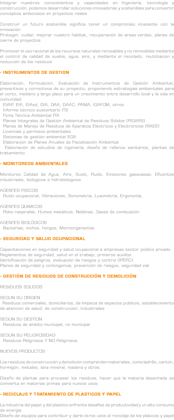 Integrar nuestros conocimientos y capacidades en Ingeniería, tecnología y construcción, podemos desarrollar soluciones innovadoras y sostenibles para convertir conceptos ambiciosos en proyectos reales. Construir un futuro sostenible significa tener un compromiso incesante con la innovación. Proteger, cuidar, mejorar nuestro habitat, recuperación de areas verdes, planes de cierre de proyectos. Promover el uso racional de los recursos naturales renovables y no renovables mediante el control de calidad de suelos, agua, aire, y mediante el reciclado, reutilizacion y reducción de los residuos - INSTRUMENTOS DE GESTION Elaboración, Formulación, Evaluación de Instrumentos de Gestión Ambiental, preventivos y correctivos de su proyecto, proponiendo estrategias ambientales para el corto, mediano y largo plazo para un crecimiento entre desarrollo local y la vida en comunidad. EVAP, EIA, EIAsd, DIA, DAA, DAAC, PAMA, IGAFOM, otros. Informe técnico sustentario ITS Ficha Técnica Ambiental FTA Planes Integrales de Gestión Ambiental de Residuos Sólidos (PIGARS) Planes de Manejo de Residuos de Aparatos Eléctricos y Electrónicos (RAEE) Licencias y permisos ambientales. Sistemas de gestión ambiental SGA Elaboracion de Planes Anuales de Fiscalización Ambiental. Elaboración de estudios de ingeniería, diseño de rellenos sanitarios, plantas de tratamiento. - MONITOREOS AMBIENTALES Monitoreo Calidad de Agua, Aire, Suelo, Ruido, Emisiones gaseoasas, Efluentes industriales, biologicos e hidrobiologicos AGENTES FISICOS Ruido ocupacional, Vibraciones, Sonometria, Luxometria, Ergonomía, AGENTES QUIMICOS Polvo respirable, Humos metálicos, Neblinas, Gases de combustión AGENTES BIOLÓGICOS Bacterias, mohos, hongos, Microorganismos - SEGURIDAD Y SALUD OCUPACIONAL Capacitaciones en seguridad y salud ocupacional a empresas sector público privado. Reglamentos de seguridad, salud en el trabajo, primeros auxilios. Identificación de peligros, evaluación de riesgos y control (IPERC). Planes de seguridad y contingencia, prevención de riesgos, seguridad vial. - GESTIÓN DE RESIDUOS DE CONSTRUCCIÓN Y DEMOLICIÓN RESIDUOS SOLIDOS SEGUN SU ORIGEN Residuos comerciales, domiciliarios, de limpieza de espacios publicos, establecimiento de atencion de salud, de construccion, Industriales SEGUN SU GESTION Residuos de ambito municipal, no municipal SEGUN SU PELIGROSIDAD Residuos Peligrosos Y NO Peligrosos NUEVOS PRODUCTOS Los residuos de construcción y demolición comprenden materiales, como ladrillo, cartón, hormigón, metales, lana mineral, madera y otros. Diseño de plantas para procesar los residuos, hacer que la materia desechada se convierta en materias primas para nuevos usos. - RECICLAJE Y TRATAMIENTO DE PLASTICOS Y PAPEL La industria del papel y del plastico enfrenta desafíos de productividad y un alto consumo de energía. Diseño de equipos para contribuir y darle otros usos al reciclaje de los platicos y papel