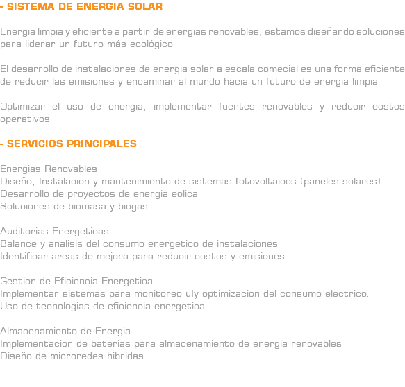 - SISTEMA DE ENERGIA SOLAR Energia limpia y eficiente a partir de energias renovables, estamos diseñando soluciones para liderar un futuro más ecológico. El desarrollo de instalaciones de energia solar a escala comecial es una forma eficiente de reducir las emisiones y encaminar al mundo hacia un futuro de energia limpia. Optimizar el uso de energia, implementar fuentes renovables y reducir costos operativos. - SERVICIOS PRINCIPALES Energias Renovables Diseño, Instalacion y mantenimiento de sistemas fotovoltaicos (paneles solares) Desarrollo de proyectos de energia eolica Soluciones de biomasa y biogas Auditorias Energeticas Balance y analisis del consumo energetico de instalaciones Identificar areas de mejora para reducir costos y emisiones Gestion de Eficiencia Energetica Implementar sistemas para monitoreo u¡y optimizacion del consumo electrico. Uso de tecnologias de eficiencia energetica. Almacenamiento de Energia Implementacion de baterias para almacenamiento de energia renovables Diseño de microredes hibridas